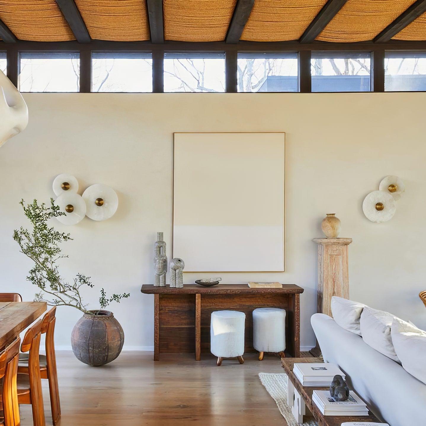 Illuminate your space with elegance! The Alabaster Flush Mount Round LED Wall Light brings sculptural beauty and warm illumination to any room. With its stunning translucent alabaster discs and refined brass accents, this piece effortlessly combines traditional artistry with a modern flair.